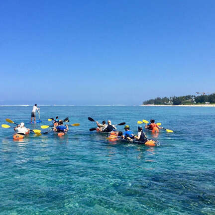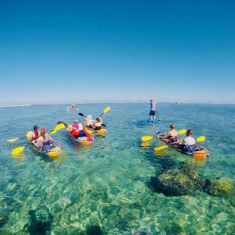 Idéal pour découvrir les coraux et les nombreux poissons du lagon, une sortie guidée en Kayak Transparent est une activité aussi ludique que pédagogique. Faciles et originales, ces petites embarcations en plexiglas offrent une vue plongeante sur toute la vie aquatique qui foisonne, à faible profondeur. La visite guidée de Sébastien, qui nous précède en paddle, est passionnante. C’est l’occasion pour notre accompagnateur de nous expliquer comment fonctionne cet écosystème ainsi que les menaces qui pèsent sur ce milieu naturel si fragile. Il connaît le lagon comme sa poche et nous le suivons pour y découvrir les magnifiques bénitiers, patates et autres coraux splendides. Balistes, murènes, demoiselles et poissons papillons viennent nous saluer sous l’embarcation. Après une heure et demie de visite, ils n’ont plus de secret pour nous !
