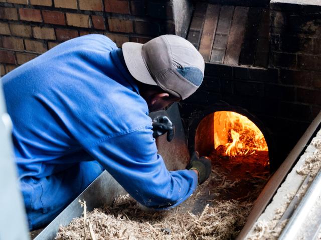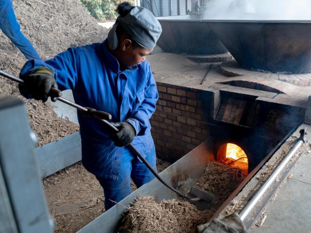 Sucrerie-distillerie Payet & Rivière: le feu est alimenté grâce à la bagasse (résidu fibreux issu du broyage de la canne à sucre une fois que l'on en a extrait le suc )