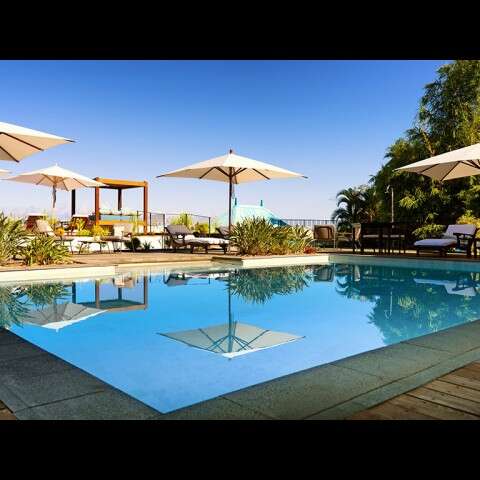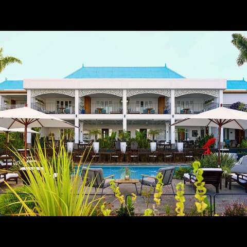 Construit au-dessus de la ville, l’établissement, nouvellement affilié à la prestigieuse famille des « Relais & Châteaux », offre une vue panoramique imprenable sur le bleu de l’océan Indien. Du bord de la piscine comme de la terrasse de notre chambre, l’horizon marin se dévoile sous la douce lumière tropicale de cette fin d’après-midi.